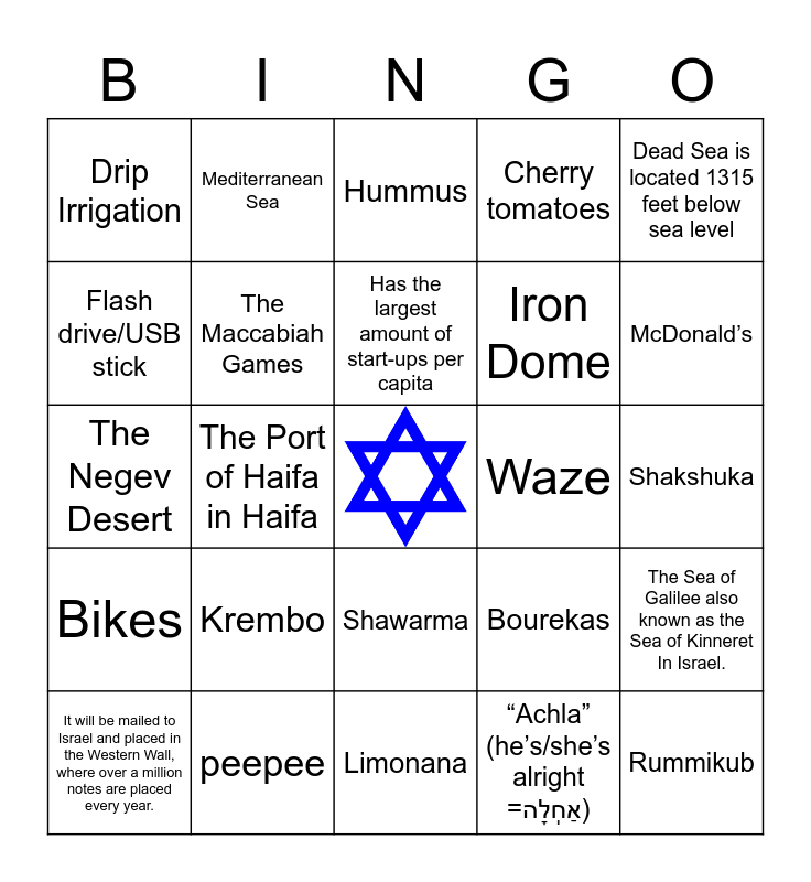 This bingo card has a free space and 61 words: “Hofer” (Digger=חוֹפֵר), peepee, Something is just perfect, shorthand for the word Mushlam (perfect= מֻשְׁלָם), Bikes, “Achla” (he’s/she’s alright =אַחְלָה), 12 (symbolize the Twelve Tribes of Israel), The Maccabiah Games, Video camera, Iron Dome, Air, Cherry tomatoes, Firewalls, Flash drive/USB stick, 13, ~2000 years, Drip Irrigation, Rummikub, Dead Sea is located 1315 feet below sea level, Museums, Has the largest amount of start-ups per capita, Waze, Hummus, It will be mailed to Israel and placed in the Western Wall, where over a million notes are placed every year., The Sea of Galilee also known as the Sea of Kinneret In Israel., Satellites, Makhtesh, 9 Million, (particularly 8.9 million), McDonald’s, Postage Stamp Glue, A box for tzedakah: charity., Jerusalem, The Old City(Jerusalem), Egypt, Lebanon, Syria, and Jordan., Mediterranean Sea, Eilat, Mount Hermon, The Port of Haifa in Haifa, Tel Aviv, The Negev Desert, Hummus, Krembo, Shakshuka, Sabich, Bourekas, Tabouli, Malawach, Knafeh, Tahini, Shawarma, Limonana, 1948, Theodore Herzl, The Balfour declaration., Haganah, David Ben-Gurion, The Six Day War, Golda Meir, Bar Refaeli, Gene Simmons and Gal Gadot.