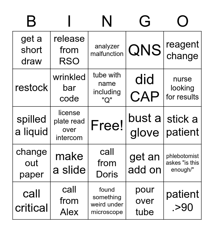 This bingo card has a free space and 44 words: cancel and reorder, patient .>90, ran QC, call critical, use pipette, pour over tube, analyzer malfunction, fax results, reagent change, call from Alex, QNS, bust a glove, call from Doris, make a slide, answer direct line, found something weird under microscope, made a parafilm creature, spilled a liquid, consult, nurse looking for results, release from RSO, hunt down specimen, have a stat, get a short draw, get a call from Tamara, stick a patient, "special delivery" from reception, lunch coverage for NCC, get an add on, change out paper, med team call over intercom, phlebotomist askes "is this enough/", manual entry of results, process holds, license plate read over intercom, rerun specimen, check email, tube with name including "Z", tube with name including "Q", restock, did CAP, call from Misty, wrinkled bar code and print a new label.