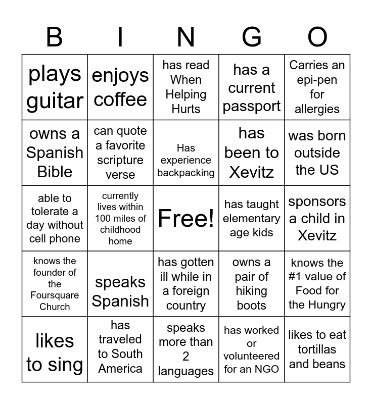 This bingo card has a free space and 24 words: speaks Spanish, has traveled to South America, Has experience backpacking, likes to sing, Carries an epi-pen for allergies, plays guitar, owns a Spanish Bible, enjoys coffee, has taught elementary age kids, has gotten ill while in a foreign country, has been to Xevitz, able to tolerate a day without cell phone, owns a pair of hiking boots, knows the #1 value of Food for the Hungry, can quote a favorite scripture verse, has worked or volunteered for an NGO, sponsors a child in Xevitz, has read When Helping Hurts, was born outside the US, currently lives within 100 miles of childhood home, likes to eat tortillas and beans, knows the founder of the Foursquare Church, has a current passport and speaks more than 2 languages.