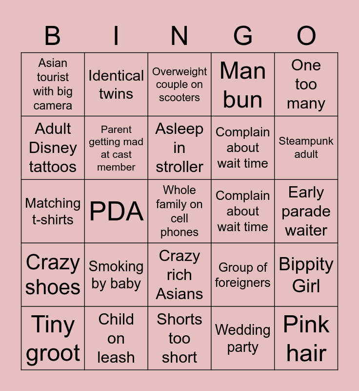This bingo card has 25 words: Crazy shoes, Child on leash, Whole family on cell phones, Wedding party, One too many, Asian tourist with big camera, Identical twins, Overweight couple on scooters, Complain about wait time, Bippity Girl, Adult Disney tattoos, Parent getting mad at cast member, Shorts too short, Group of foreigners, Steampunk adult, Tiny groot, PDA, Asleep in stroller, Complain about wait time, Early parade waiter, Matching t-shirts, Smoking by baby, Crazy rich Asians, Man bun and Pink hair.
