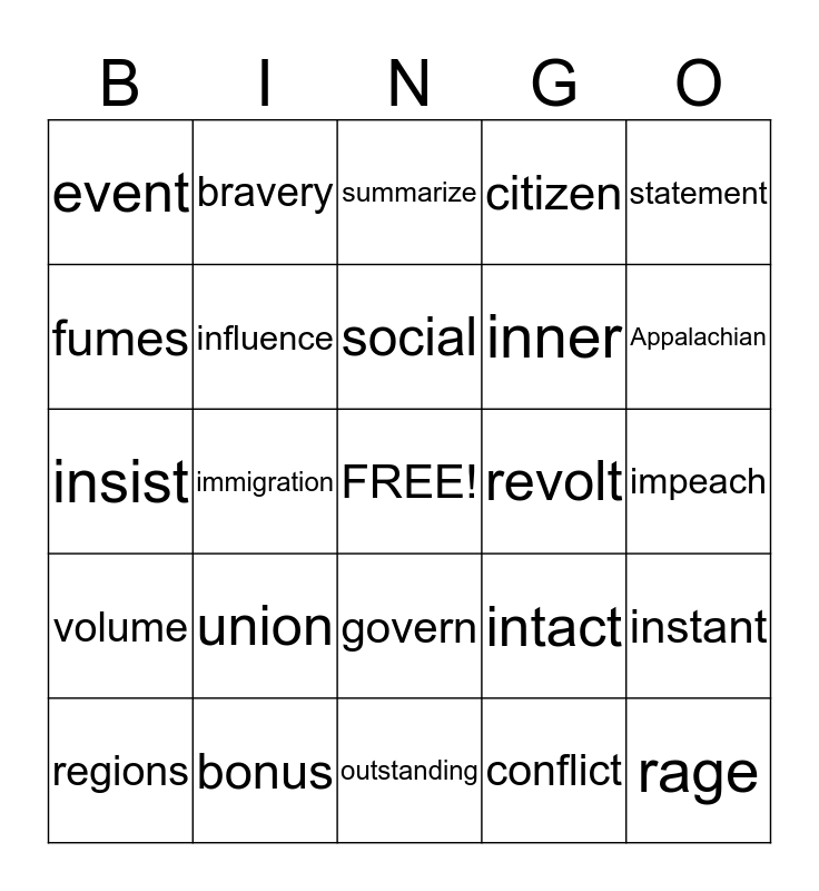This bingo card has a free space and 24 words: union, bonus, social, regions, statement, event, fumes, bravery, revolt, govern, inner, insist, intact, instant, influence, conflict, impeach, summarize, Appalachian, immigration, rage, volume, citizen and outstanding.