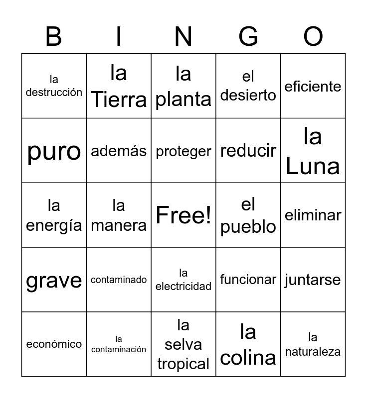 This bingo card has a free space and 43 words: el bosque, la naturaleza, el valle, económico, conservar, la colina, la planta, ahorrar, eficiente, la contaminación, el desierto, el pueblo, la electricidad, contaminado, el espacio, la selva tropical, el aire acondicionado, la energía, contra, la Luna, la Tierra, la calefacción, solar, la destrucción, ecológico, eliminar, en peligro de extinción, la fuente, funcionar, grave, la guerra, juntarse, luchar, la manera, el medio ambiente, mejorar, la paz, proteger, puro, reducir, resolver, además and dudar.