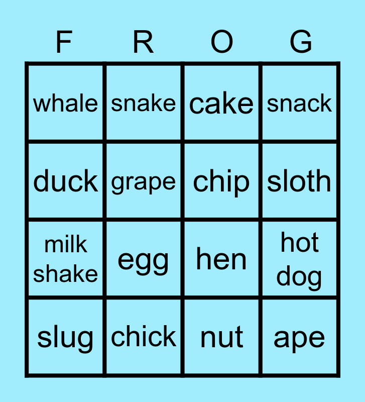 This bingo card has 16 words: chick, hot dog, cake, whale, milk shake, snake, hen, nut, duck, grape, slug, snack, egg, sloth, chip and ape.