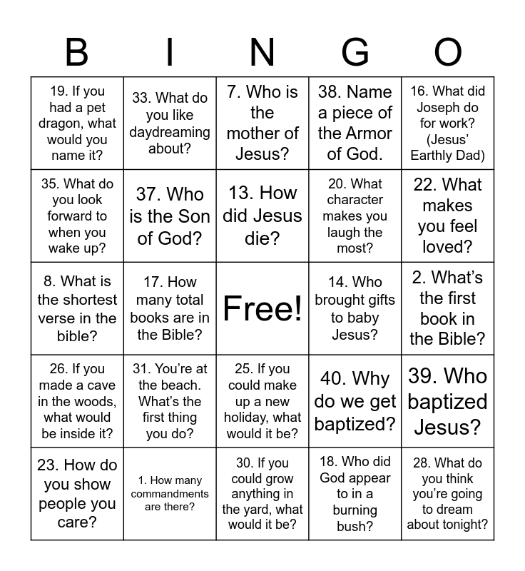 This bingo card has a free space and 47 words: 27. How do you best like helping others?, 28. What do you think you’re going to dream about tonight?, 29. If your stuffed animals could talk, what would they say?, 30. If you could grow anything in the yard, what would it be?, 31. You’re at the beach. What’s the first thing you do?, 32. What’s your Superhero name and what powers do you have?, 33. What do you like daydreaming about?, 34. What makes you happy?, 35. What do you look forward to when you wake up?, 36. What sea did Jesus calm in the storm?, 37. Who is the Son of God?, 38. Name a piece of the Armor of God., 39. Who baptized Jesus?, 40. Why do we get baptized?, 41. John 3:16, 42. Psalm 56:3, 13. How did Jesus die?, 14. Who brought gifts to baby Jesus?, 15. True or False. The bible is the most sold book?, 16. What did Joseph do for work? (Jesus’ Earthly Dad), 17. How many total books are in the Bible?, 18. Who did God appear to in a burning bush?, 19. If you had a pet dragon, what would you name it?, 20. What character makes you laugh the most?, 21. What makes you feel brave?, 22. What makes you feel loved?, 23. How do you show people you care?, 24. If you could ask a wild animal any question, what would you ask?, 25. If you could make up a new holiday, what would it be?, 26. If you made a cave in the woods, what would be inside it?, 43. Luke 6:31, 44. Matthew 22:39, 45. EPHESIANS 4:32, 46. 1 TIMOTHY 4:12, 47. JOHN 1:1, 1. How many commandments are there?, 2. What’s the first book in the Bible?, 3. Who were the first man and women on this earth?, 4. How many days was the world created in?, 5. After God created the world, what did He do?, 6. Where did Adam and Eve first live?, 7. Who is the mother of Jesus?, 8. What is the shortest verse in the bible?, 9. Where was Jesus’ body put after it hung on the cross?, 10. How many days was Jesus in the tomb?, 11. What does the word “gospel” mean? and 12. How many apostles did Jesus have?.