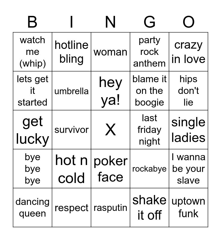 This bingo card has a free space and 34 words: oops! I did it again, shake it off, wannabe, mambo nr.5, bye bye bye, umbrella, crazy in love, dancing queen, hotline bling, macarena, hey ya!, woman, Where are you now, s&m, last friday night, hips don't lie, respect, get lucky, hot n cold, rockabye, poker face, gangnam style, watch me (whip), single ladies, rasputin, uptown funk, party rock anthem, cupid shuffle, blame it on the boogie, lets get it started, sweet dreams, survivor, I wanna be your slave and hotel room service.
