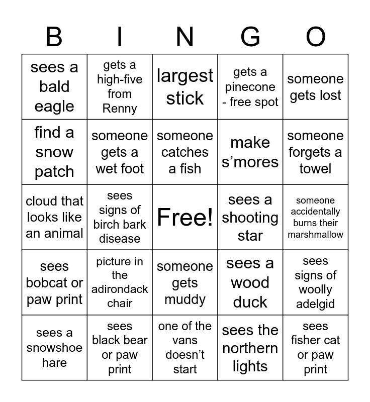 This bingo card has a free space and 35 words: see a moose, animal shaped rock, dr. mangan beats you up the hill, someone gets a wet foot, someone gets muddy, gets a pinecone - free spot, find a snow patch, campfire night, someone catches a fish, someone finds deer shed, cloud that looks like an animal, someone gets lost, someone gets wet in a canoe, hears a loon, sees a bald eagle, sees a shooting star, sees the northern lights, sees signs of birch bark disease, sees bobcat or paw print, sees fisher cat or paw print, sees a wood duck, sees a snowshoe hare, sees signs of woolly adelgid, sees black bear or paw print, largest stick, someone forgets a towel, someone jumps in the lake, gets sunburnt, make s’mores, someone accidentally burns their marshmallow, someone sees an owl, one of the vans doesn’t start, picture in the adirondack chair, gets a high-five from Renny and finds a salamander.