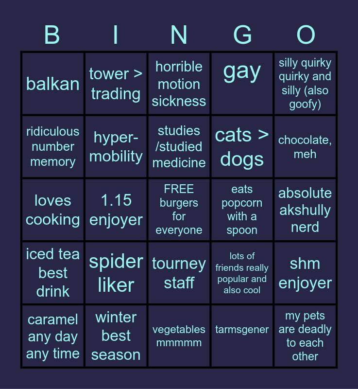 This bingo card has a free space and 24 words: caramel any day any time, spider liker, studies /studied medicine, tarmsgener, silly quirky quirky and silly (also goofy), balkan, tower > trading, horrible motion sickness, eats popcorn with a spoon, absolute akshully nerd, loves cooking, hyper- mobility, lots of friends really popular and also cool, shm enjoyer, ridiculous number memory, winter best season, vegetables mmmmm, gay, chocolate, meh, iced tea best drink, 1.15 enjoyer, tourney staff, cats > dogs and my pets are deadly to each other.