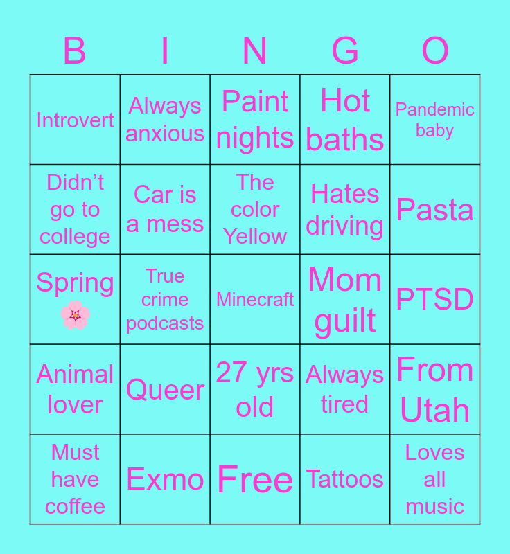 This bingo card has 25 words: Animal lover, Exmo, Minecraft, Tattoos, Pandemic baby, Introvert, Always anxious, Paint nights, Mom guilt, From Utah, Didn’t go to college, Car is a mess, Free, Always tired, Pasta, Must have coffee, True crime podcasts, The color Yellow, Hates driving, PTSD, Spring 🌸, Queer, 27 yrs old, Hot baths and Loves all music.