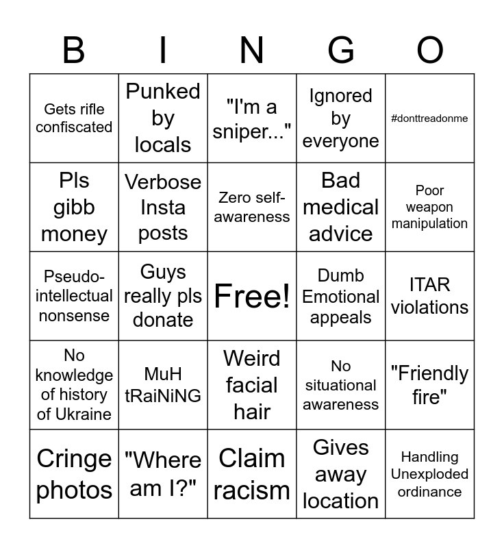 This bingo card has a free space and 24 words: MuH tRaiNiNG, "Where am I?", Zero self-awareness, Cringe photos, #donttreadonme, Gets rifle confiscated, Pls gibb money, Punked by locals, Dumb Emotional appeals, Weird facial hair, Bad medical advice, Pseudo-intellectual nonsense, No situational awareness, "Friendly fire", Verbose Insta posts, Gives away location, ITAR violations, "I'm a sniper...", Poor weapon manipulation, Guys really pls donate, Handling Unexploded ordinance, No knowledge of history of Ukraine, Ignored by everyone and Claim racism.