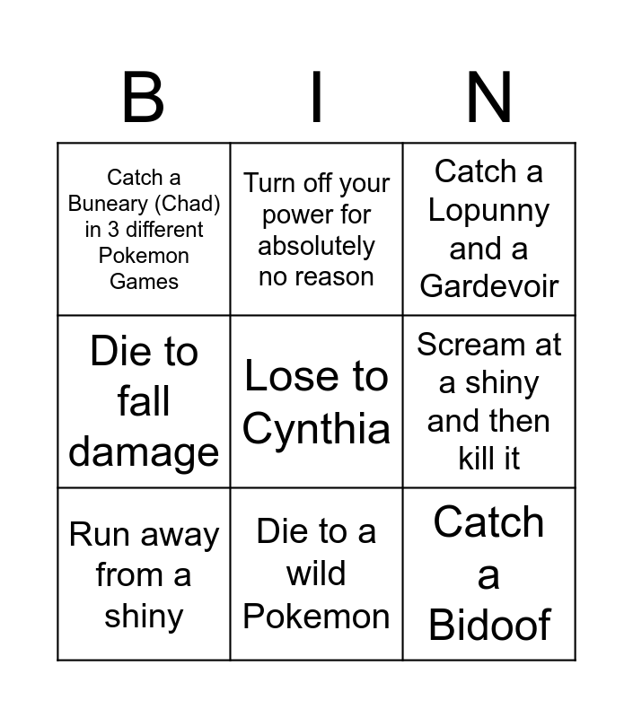 This bingo card has 9 words: Run away from a shiny, Lose to Cynthia, Catch a Lopunny and a Gardevoir, Catch a Buneary (Chad) in 3 different Pokemon Games, Turn off your power for absolutely no reason, Scream at a shiny and then kill it, Die to fall damage, Die to a wild Pokemon and Catch a Bidoof.