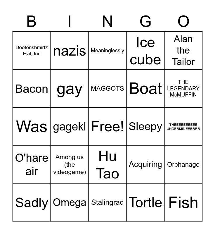 This bingo card has a free space and 24 words: Among us (the videogame), Omega, MAGGOTS, Sadly, Alan the Tailor, Doofenshmirtz Evil, Inc, Bacon, nazis, Sleepy, Hu Tao, Boat, Was, Acquiring, Orphanage, gay, Tortle, THEEEEEEEEEE UNDERMINEEERRR, Meaninglessly, THE LEGENDARY McMUFFIN, gagekl, Fish, O'hare air, Ice cube and Stalingrad.