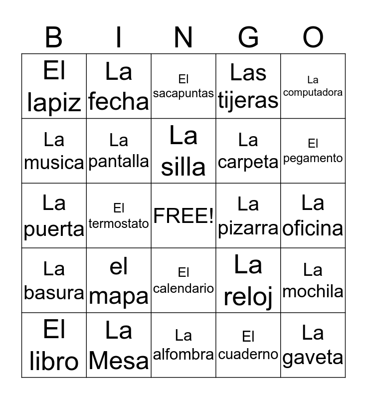 This bingo card has a free space and 24 words: el mapa, La Mesa, La silla, El libro, La computadora, El lapiz, La musica, La fecha, La pizarra, El calendario, La carpeta, La puerta, La reloj, La mochila, La pantalla, El cuaderno, La oficina, El sacapuntas, El pegamento, El termostato, La gaveta, La basura, Las tijeras and La alfombra.