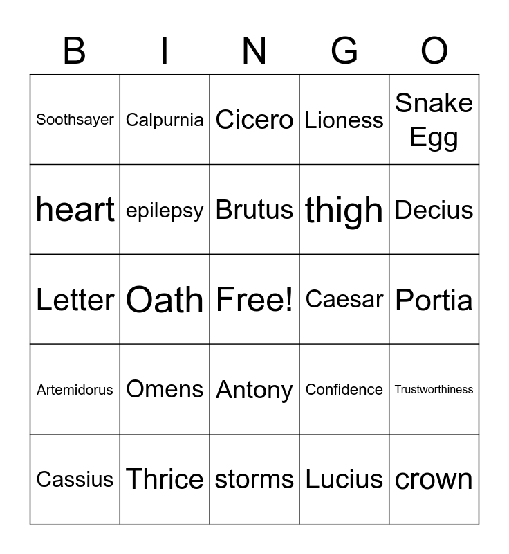 This bingo card has a free space and 24 words: Omens, Thrice, Brutus, Cassius, Snake Egg, Soothsayer, heart, Calpurnia, Caesar, Antony, thigh, Letter, Confidence, Trustworthiness, epilepsy, Lucius, Portia, Cicero, Decius, Oath, crown, Artemidorus, Lioness and storms.