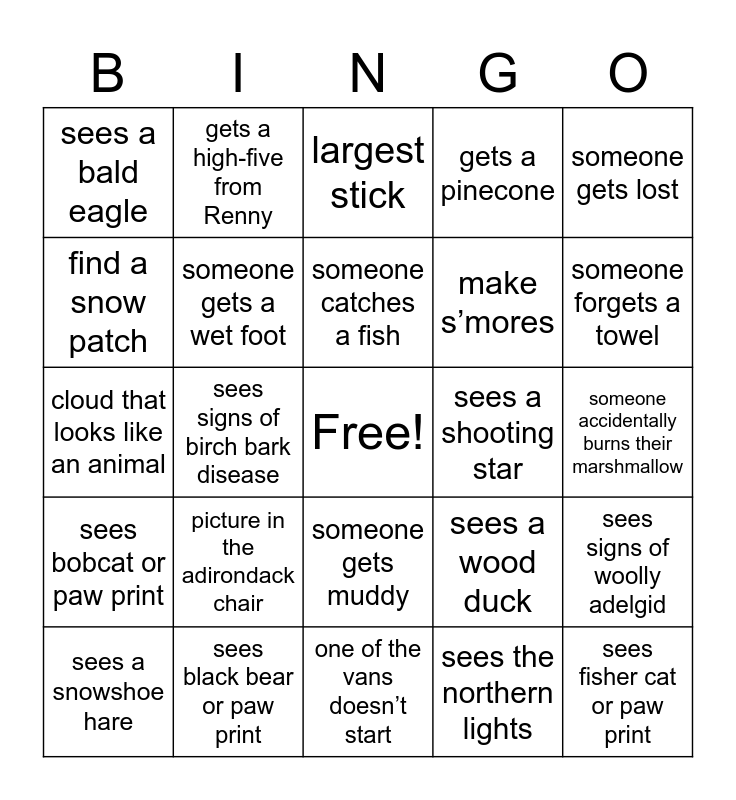 This bingo card has a free space and 35 words: see a moose, animal shaped rock, Dr. Mangan beats you up the hill, someone gets a wet foot, someone gets muddy, gets a pinecone, find a snow patch, campfire night, someone catches a fish, someone finds deer shed, cloud that looks like an animal, someone gets lost, someone gets wet in a canoe, hears a loon, sees a bald eagle, sees a shooting star, sees the northern lights, sees signs of birch bark disease, sees bobcat or paw print, sees fisher cat or paw print, sees a wood duck, sees a snowshoe hare, sees signs of woolly adelgid, sees black bear or paw print, largest stick, someone forgets a towel, someone jumps in the lake, gets sunburnt, make s’mores, someone accidentally burns their marshmallow, someone sees an owl, one of the vans doesn’t start, picture in the adirondack chair, gets a high-five from Renny and finds a salamander.