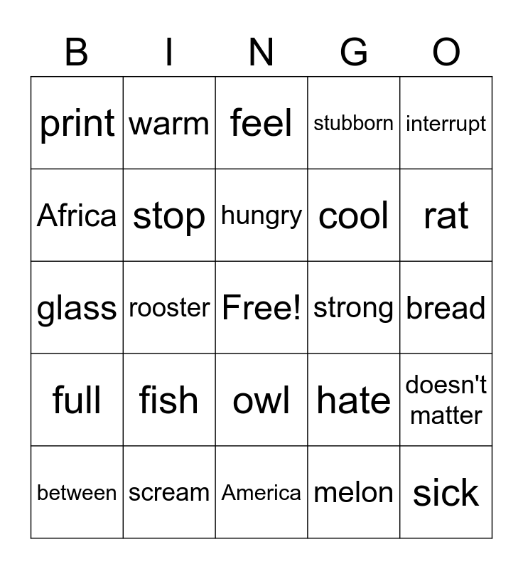 This bingo card has a free space and 24 words: fish, scream, hungry, between, interrupt, print, Africa, warm, strong, owl, cool, glass, hate, doesn't matter, stop, melon, bread, feel, rat, rooster, sick, full, stubborn and America.