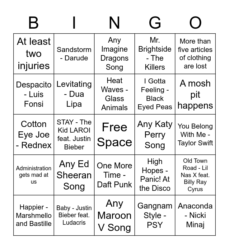 This bingo card has a free space and 24 words: Any Ed Sheeran Song, Baby - Justin Bieber feat. Ludacris, Heat Waves - Glass Animals, Happier - Marshmello and Bastille, More than five articles of clothing are lost, At least two injuries, Despacito - Luis Fonsi, Sandstorm - Darude, Any Katy Perry Song, One More Time - Daft Punk, I Gotta Feeling - Black Eyed Peas, Cotton Eye Joe - Rednex, High Hopes - Panic! At the Disco, Old Town Road - Lil Nas X feat. Billy Ray Cyrus, Levitating - Dua Lipa, Gangnam Style - PSY, You Belong With Me - Taylor Swift, Any Imagine Dragons Song, A mosh pit happens, STAY - The Kid LAROI feat. Justin Bieber, Anaconda - Nicki Minaj, Administration gets mad at us, Mr. Brightside - The Killers and Any Maroon V Song.