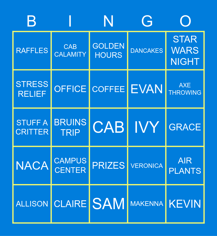 This bingo card has a free space and 54 words: JOHN CASSIDY, NACA, MONDAYS, LION KING, PRIZES, ICE CREAM, DANCAKES, SCENTED ORBEES, STRESS RELIEF, HOMECOMING, RAFFLES, SWAGON, CLAIRE, ALLISON, COURTNEY, SAM, KEVIN, EVAN, JACKIE, GRACE, VERONICA, MADDIE, IVY, STAR WARS NIGHT, THERAPY DOGS, CAB CALAMITY, TSHIRTS, SNACKS, RED SOX TRIP, MAKENNA, COLIN, GIANNA, SPUDS YOUR WAY, PROGRAMS, GOLDEN HOURS, SWEATPANTS, STUFF A CRITTER, AIR PLANTS, WAFFLE ON A STICK, OFFICE, NOVELTIES, GIVEAWAYS, COMMON HOUR, RIVERS, CAMPUS CENTER, DELISO LAWN, HLC, DHALL (ucommons if ur claire), COFFEE, BRUINS TRIP, AXE THROWING, INSTAGRAM, KODIAK and CANVA.