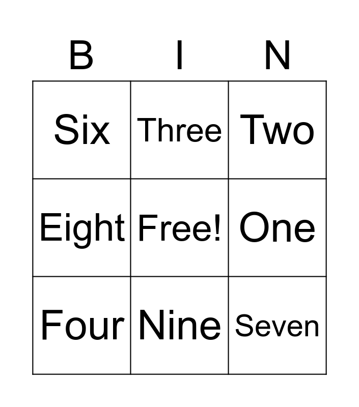This bingo card has a free space and 8 words: One, Two, Three, Four, Six, Seven, Eight and Nine.