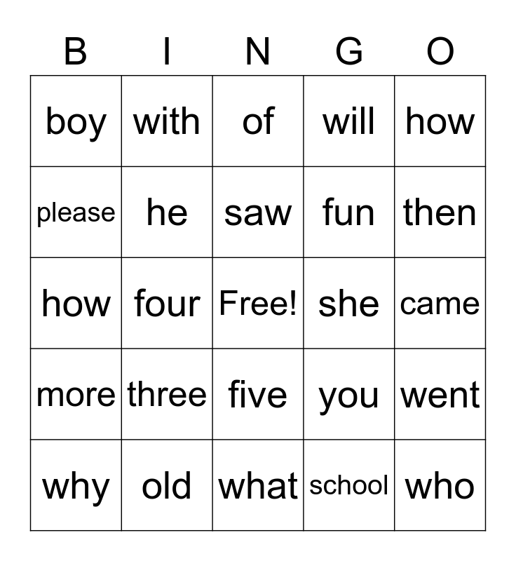 This bingo card has a free space and 24 words: three, old, saw, why, how, boy, please, with, she, five, fun, how, you, went, he, school, came, of, then, four, who, more, will and what.