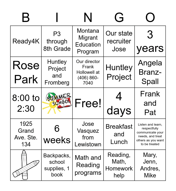 This bingo card has 4 images, a free space and 25 words: Ready4K, Montana Migrant Education Program, Huntley Project and Fromberg, 6 weeks, 4 days, Backpacks, school supplies, 1 book, Frank and Pat, Mary, Jenn, Andres, Mike, Math and Reading programs, Reading, Math, Homework help, Angela Branz-Spall, Make a qualify move to do certain things, Jose Vasquez from Lewistown, 1925 Grand Ave. Ste. 134, 3 years, 8:00 to 2:30, Breakfast and Lunch, Mary Stark, Huntley Project, Rose Park, Our state recruiter Jose, P3 through 8th Grade, Listen and learn, respectfully communicate your needs, and treat others as you want to be treated, Our director Frank Hollowell at (406) 860-7040 and Yes including the staff.