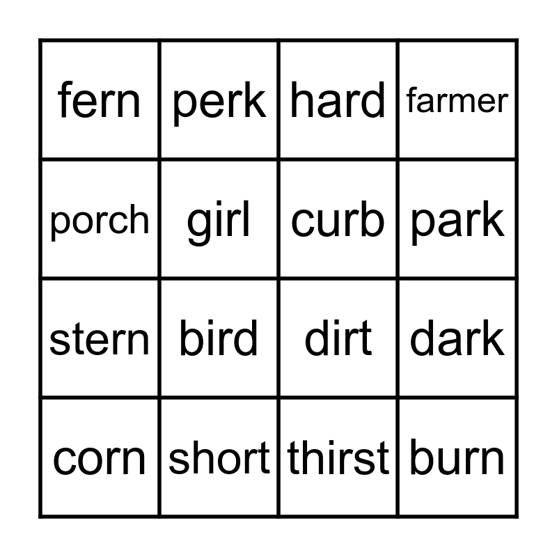This bingo card has 20 words: dark, far, hard, fork, corn, porch, short, fern, stern, perk, bird, dirt, girl, burn, curb, fur, park, farmer, thirst and surf.
