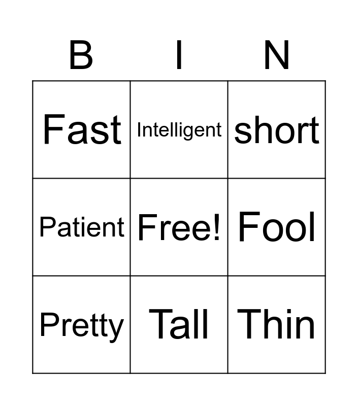 This bingo card has a free space and 24 words: Happy, Sad, Tall, Fat, Thin, Fast, Fool, Intelligent, Slow, Short, New, Young, Long, Old, Pretty, ugly, Tall, short, Quiet, loud, Nervous, calm, Patient and impatient.