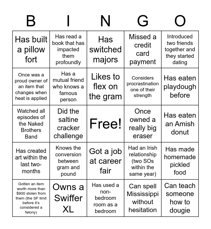 This bingo card has a free space and 100 words: Can finish this sentence, “Life’s like a box of ___”, Has curly hair but wants straight hair, Has eaten an Amish donut, Ate pufferfish, Has eaten a critter before, Went out on a Tuesday, Plays an obscure sport, Has thrown up after eating, Can located where Uzbekistan is on a map, Enjoys watching the sunrise, Had their hands tied up before, Uses decorative band aids instead of the regular ones, Talked someone out of doing something reckless/dangerous, Owns a Swiffer XL, Has a really hot friend, Went to a developer conference, Considers procrastination one of their strength, Has pet an exotic animal, Has clothing with dots on it, Has a mild addiction to painkillers, Has ghosted a date before, Went out on a Monday, Has been described as “sensitive”, Was on a debate team, Has fainted before, Once owned a really big eraser, Introduced two friends together and they started dating, Had an Irish relationship (two SOs within the same year), Won money at bingo, Can name 10 non-Olympic sports that are classified as sports, Did the saltine cracker challenge, Has built a pillow fort, Has more than 5 magnets on their fridge, Knows the rules of football, Can spell Mississippi without hesitation, Likes to flex on the gram, Has made homemade pickled food, Ate at a Michelin restaurant before, Knows how to count to 10 in 3+ languages, Knows someone who is a sugar baby, Owns a Thermoflask, Talks to themselves at least once a day, Watched all episodes of the Naked Brothers Band, Has went on a diet, Has eaten playdough before, Has switched majors, Knows a famous person, Has ridden on a motorcycle, Knows who the most famous member of DNCE is, Has used a non-bedroom room as a bedroom, Has straight hair but wants curly hair, Got a refund of more than $2,000 from the IRS last tax season, Has smoked a gram of weed, Had a stranger point out you were doing something oddly outside your prescribed gender role, Likes old people more than kids, Believes in love at first sight, Can set up and finish grilling a burger without any assistance, Plans on quitting their job within the month, Likes kids more than old people, Missed a credit card payment, Is satisfied with their hair, Ate Jello within the past year, Was able to tip the iceberg in Club Penguin, Played store with the mulch at your elementary school playground, Has an outtie belly button, Has a Kevin Bacon number of 3, Eats and enjoys kale, Went out on a Wednesday, Had a shot of petrone before, Has peer pressured a friend into reckless behavior, Has played ultimate frisbee, Knows the conversion between gram and pound, Has family member who is an accountant, Drinks coffee after the sunsets, Owns lozenges, Worked less than 30 / hours a week this week, Knows the Spanish word for sweeping, Once was a proud owner of an item that changes when heat is applied, Believes in ghosts, Has upcycled, Has been to Mount Rushmore, Can teach someone how to dougie, Has seen an Amish person, Got a job at career fair, Doesn’t like romcoms, Has read a book that has impacted them profoundly, Has blacked out from alcohol, Never won a contest/giveaway ever, Can name 10 Winter Olympic sports, Has created art within the last two-months, Has been stung by a bee before, Has more than five plants in their household, Worked more than 40 / hours a week this week, Gotten an item worth more than $900 stolen from them (the SF limit before it’s considered a felony), Has a mutual friend who knows a famous person, Has moved your finger across an active flame, Has filed physical paperwork, Went to a concert for the opener, Has visited a place with less than 10,000 residents and Has bought a tax-free item before.