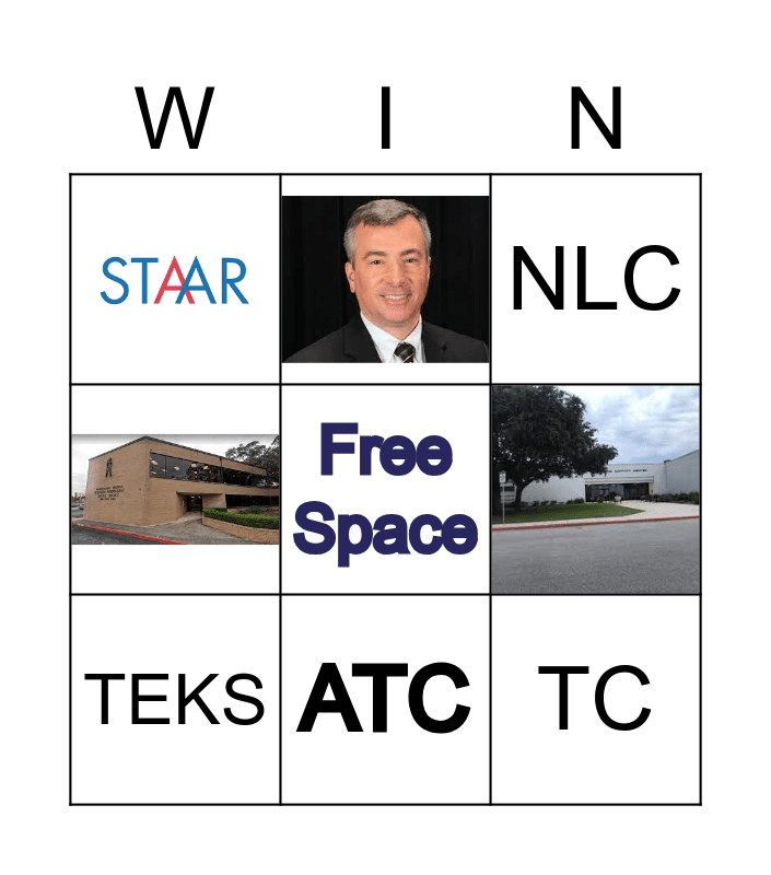 This bingo card has 4 images, a free space and 4 words: NLC, TEKS, TC and ATC.