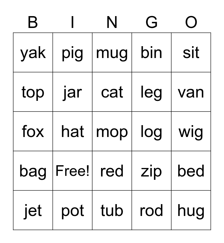 This bingo card has 25 words: Free!, tub, cat, jet, sit, yak, top, pig, log, red, leg, fox, zip, bed, jar, hug, wig, mug, van, hat, mop, pot, bag, bin and rod.
