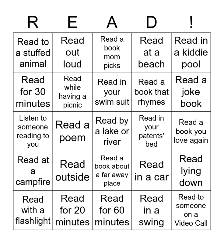 This bingo card has 25 words: Read outside, Read for 60 minutes, Read in your swim suit, Read with a flashlight, Read in a kiddie pool, Read to a stuffed animal, Read for 30 minutes, Read out loud, Read in your patents' bed, Read a book about a far away place, Read a book that rhymes, Listen to someone reading to you, Read in a car, Read lying down, Read while having a picnic, Read to someone on a Video Call, Read a book you love again, Read a book mom picks, Read a joke book, Read a poem, Read by a lake or river, Read for 20 minutes, Read at a campfire, Read at a beach and Read in a swing.