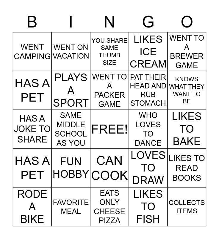This bingo card has a free space and 24 words: FUN HOBBY, FAVORITE MEAL, WENT TO A PACKER GAME, RODE A BIKE, WENT TO A BREWER GAME, WENT CAMPING, HAS A PET, WENT ON VACATION, WHO LOVES TO DANCE, CAN COOK, PAT THEIR HEAD AND RUB STOMACH, HAS A JOKE TO SHARE, LOVES TO DRAW, LIKES TO READ BOOKS, PLAYS A SPORT, LIKES TO FISH, LIKES TO BAKE, YOU SHARE SAME THUMB SIZE, KNOWS WHAT THEY WANT TO BE, SAME MIDDLE SCHOOL AS YOU, COLLECTS ITEMS, HAS A PET, LIKES ICE CREAM and EATS ONLY CHEESE PIZZA.