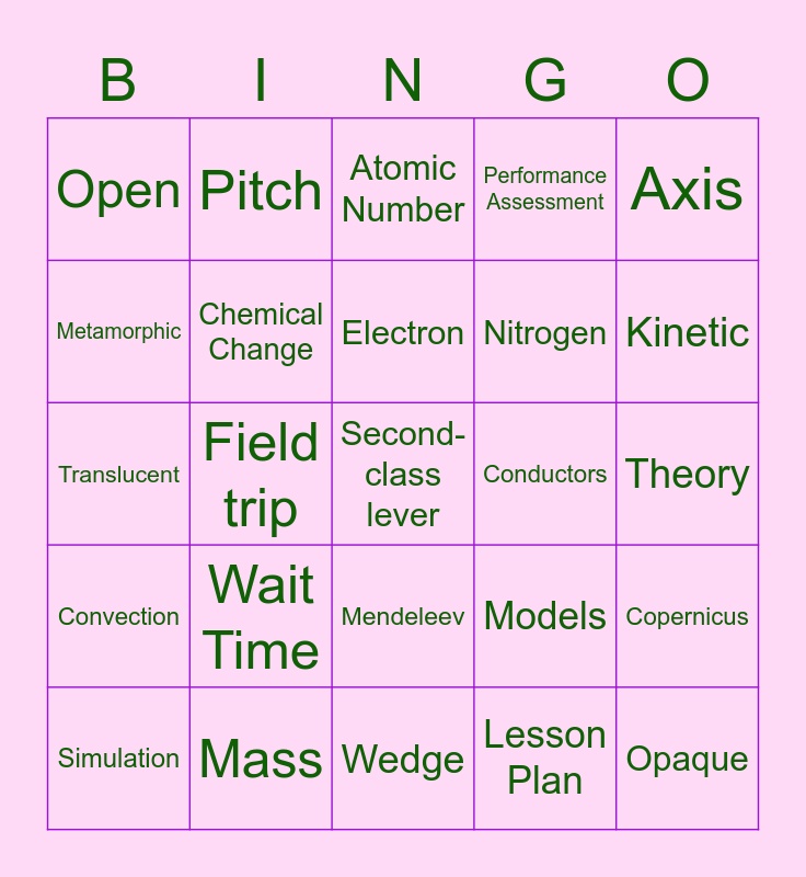 This bingo card has 25 words: Wait Time, Wedge, Electron, Simulation, Axis, Open, Metamorphic, Pitch, Conductors, Mendeleev, Nitrogen, Translucent, Models, Copernicus, Chemical Change, Opaque, Theory, Atomic Number, Kinetic, Field trip, Second-class lever, Mass, Convection, Performance Assessment and Lesson Plan.