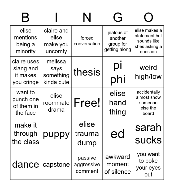 This bingo card has a free space and 24 words: puppy, capstone, thesis, dance, elise makes a statement but sounds like shes asking a question, elise mentions being a minority, claire uses slang and it makes you cringe, claire and elise make you uncomfy, elise hand thing, elise trauma dump, pi phi, want to punch one of them in the face, ed, sarah sucks, melissa says something kinda cute, awkward moment of silence, accidentally almost show someone else the board, forced conversation, weird high/low, elise roommate drama, you want to poke your eyes out, make it through the class, jealous of another group for getting along and passive aggressive comment.