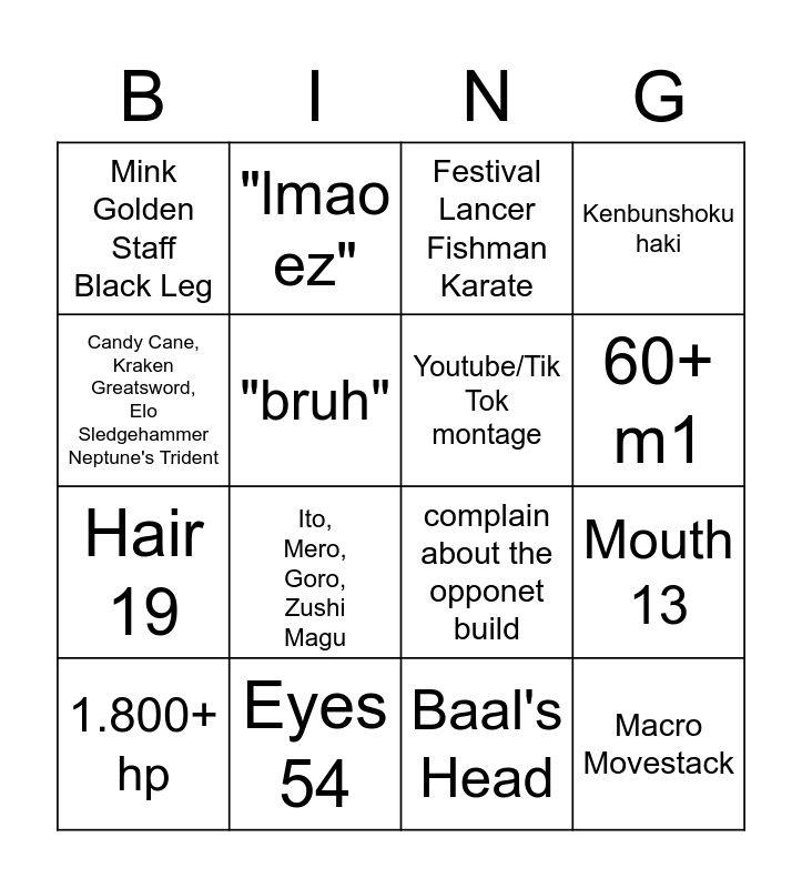 This bingo card has 16 words: Eyes 54, Mouth 13, Festival Lancer Fishman Karate, Mink Golden Staff Black Leg, Hair 19, "lmao ez", complain about the opponet build, Baal's Head, Candy Cane, Kraken Greatsword, Elo Sledgehammer Neptune's Trident, "bruh", 1.800+ hp, Kenbunshoku haki, Ito, Mero, Goro, Zushi Magu, 60+ m1, Youtube/Tik Tok montage and Macro Movestack.