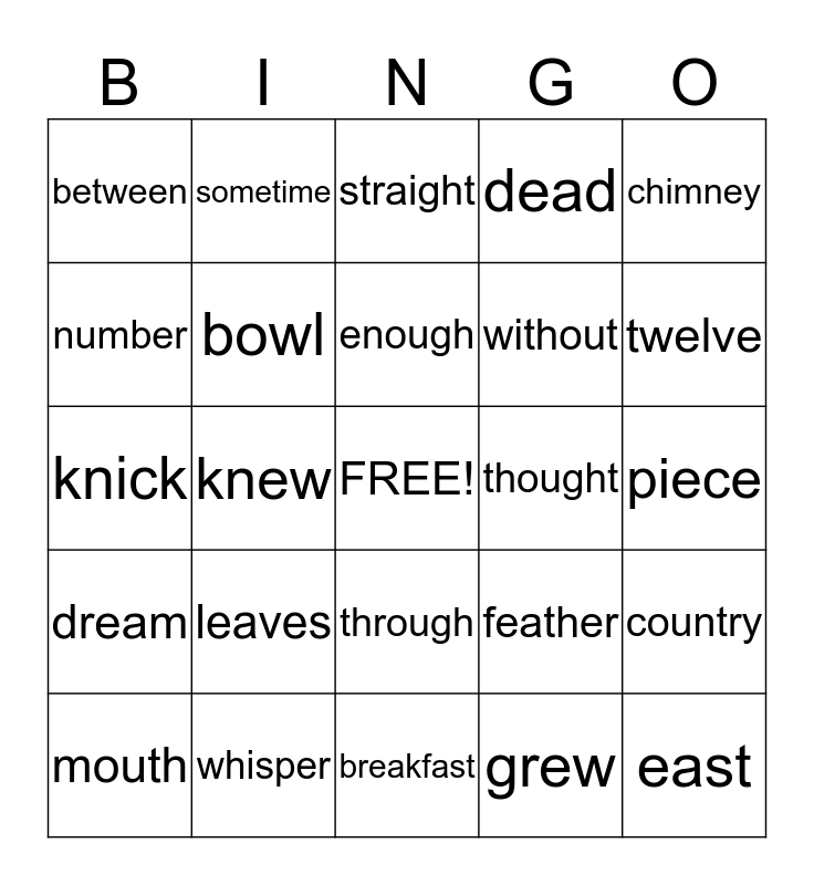 This bingo card has a free space and 24 words: leaves, whisper, enough, mouth, chimney, between, number, sometime, thought, through, without, knick, feather, country, bowl, grew, piece, straight, twelve, knew, east, dream, dead and breakfast.