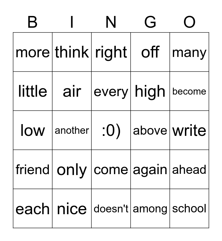 This bingo card has a free space and 24 words: only, nice, every, each, many, more, little, think, above, come, high, low, again, ahead, air, among, write, right, become, another, school, friend, off and doesn't.