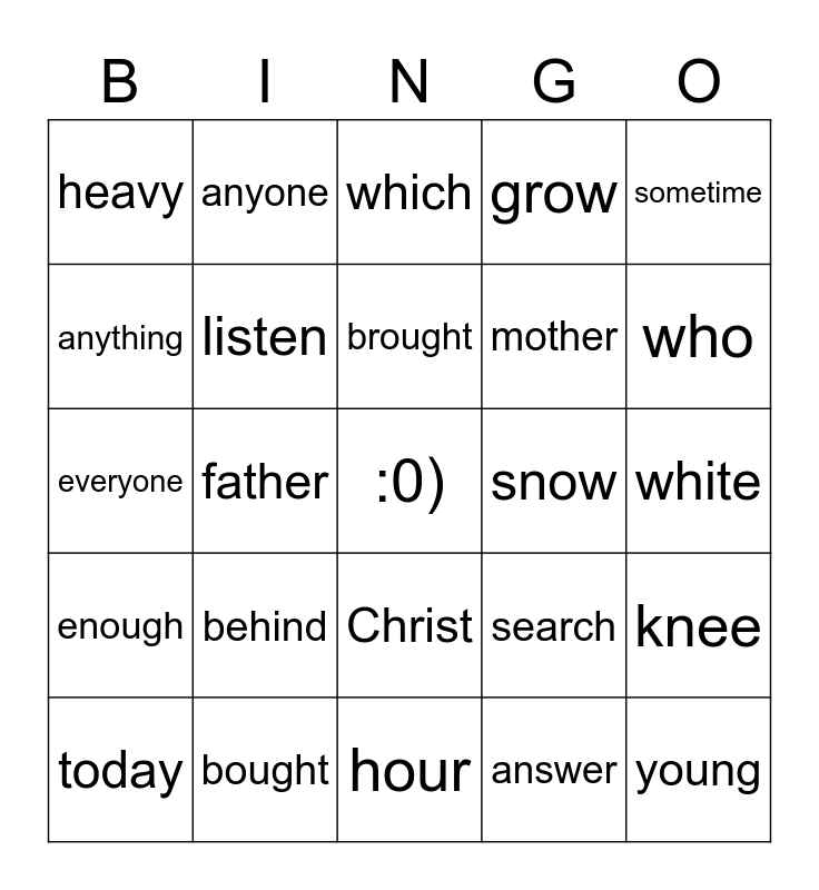 This bingo card has a free space and 24 words: behind, bought, brought, today, sometime, heavy, anything, anyone, snow, Christ, mother, everyone, search, knee, listen, answer, white, which, who, father, young, enough, grow and hour.