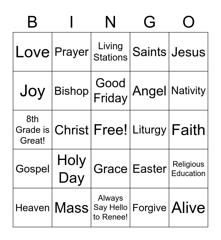 This bingo card has a free space and 24 words: Holy Day, Mass, Good Friday, Heaven, Jesus, Love, Joy, Prayer, Liturgy, Grace, Angel, 8th Grade is Great!, Easter, Religious Education, Bishop, Forgive, Faith, Living Stations, Nativity, Christ, Alive, Gospel, Saints and Always Say Hello to Renee!.