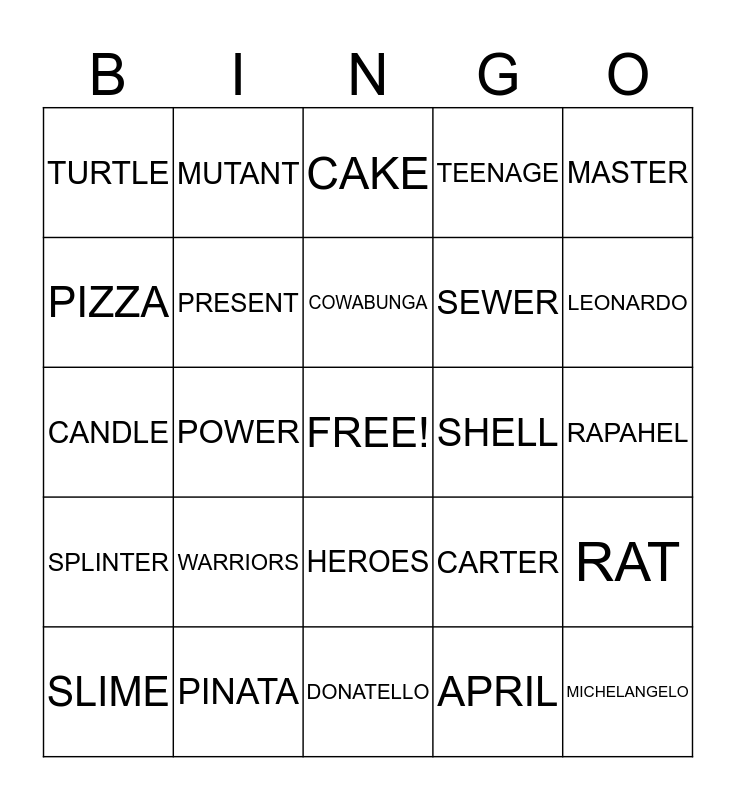 This bingo card has a free space and 29 words: SLIME, SHREDDER, POWER, NINJA, TURTLE, CAKE, PRESENT, WARRIORS, SHELL, PINATA, RAPAHEL, MICHELANGELO, DONATELLO, APRIL, LEONARDO, OOZE, HEROES, SPLINTER, MASTER, CANDLE, CARTER, AWESOME, SEWER, PIZZA, TEENAGE, MUTANT, RAT, COWABUNGA and PARTY.