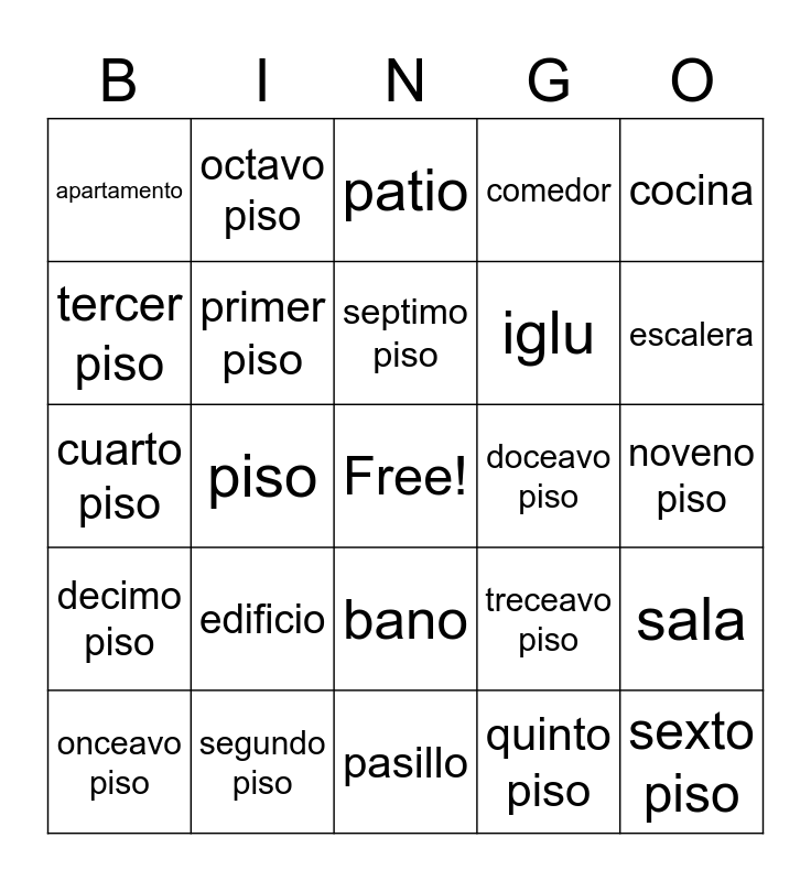 This bingo card has a free space and 24 words: edificio, segundo piso, septimo piso, onceavo piso, cocina, apartamento, tercer piso, octavo piso, doceavo piso, bano, iglu, cuarto piso, treceavo piso, sala, primer piso, quinto piso, noveno piso, patio, escalera, piso, sexto piso, decimo piso, comedor and pasillo.
