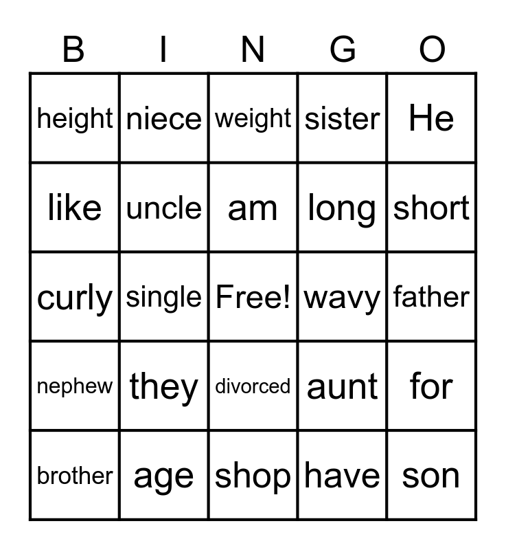 This bingo card has a free space and 24 words: they, age, am, brother, He, height, like, niece, wavy, divorced, long, curly, aunt, for, uncle, have, father, weight, short, single, son, nephew, sister and shop.