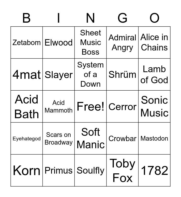 This bingo card has a free space and 24 words: Scars on Broadway, Primus, System of a Down, Korn, Alice in Chains, Zetabom, 4mat, Elwood, Cerror, Soft Manic, Shrüm, Acid Bath, Crowbar, Mastodon, Slayer, Toby Fox, Sonic Music, Sheet Music Boss, Lamb of God, Acid Mammoth, 1782, Eyehategod, Admiral Angry and Soulfly.