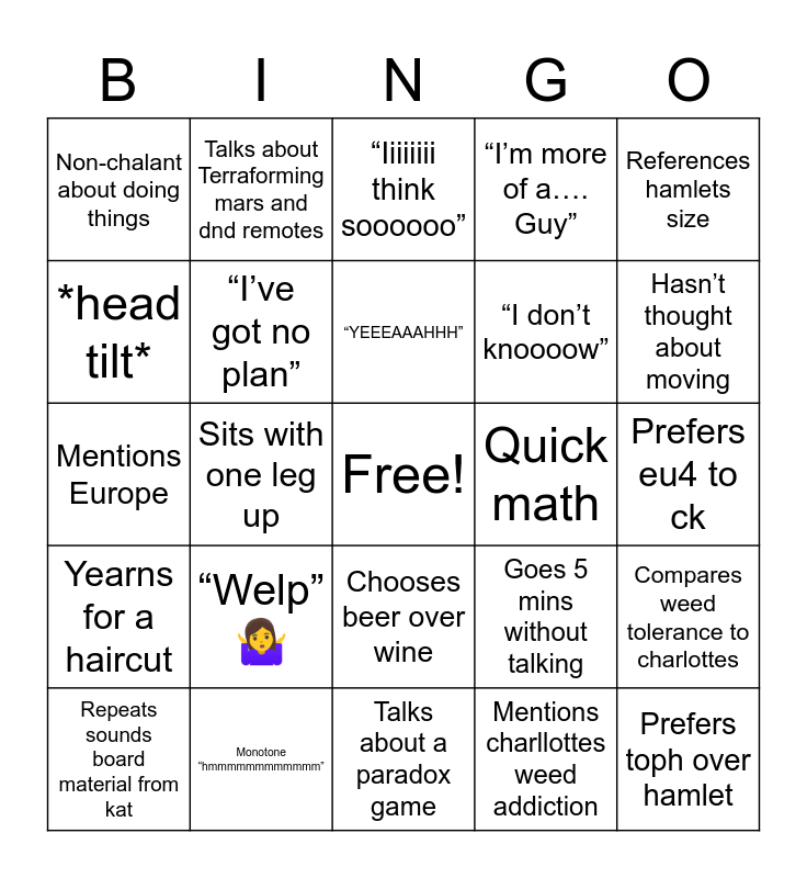 This bingo card has a free space and 24 words: “Welp” 🤷♀️, Monotone “hmmmmmmmmmmmm”, “YEEEAAAHHH”, Repeats sounds board material from kat, References hamlets size, Non-chalant about doing things, *head tilt*, Talks about Terraforming mars and dnd remotes, Quick math, Chooses beer over wine, “I don’t knoooow”, Mentions Europe, Goes 5 mins without talking, Compares weed tolerance to charlottes, “I’ve got no plan”, Mentions charllottes weed addiction, Prefers eu4 to ck, “Iiiiiiii think soooooo”, Hasn’t thought about moving, Sits with one leg up, Prefers toph over hamlet, Yearns for a haircut, “I’m more of a…. Guy” and Talks about a paradox game.