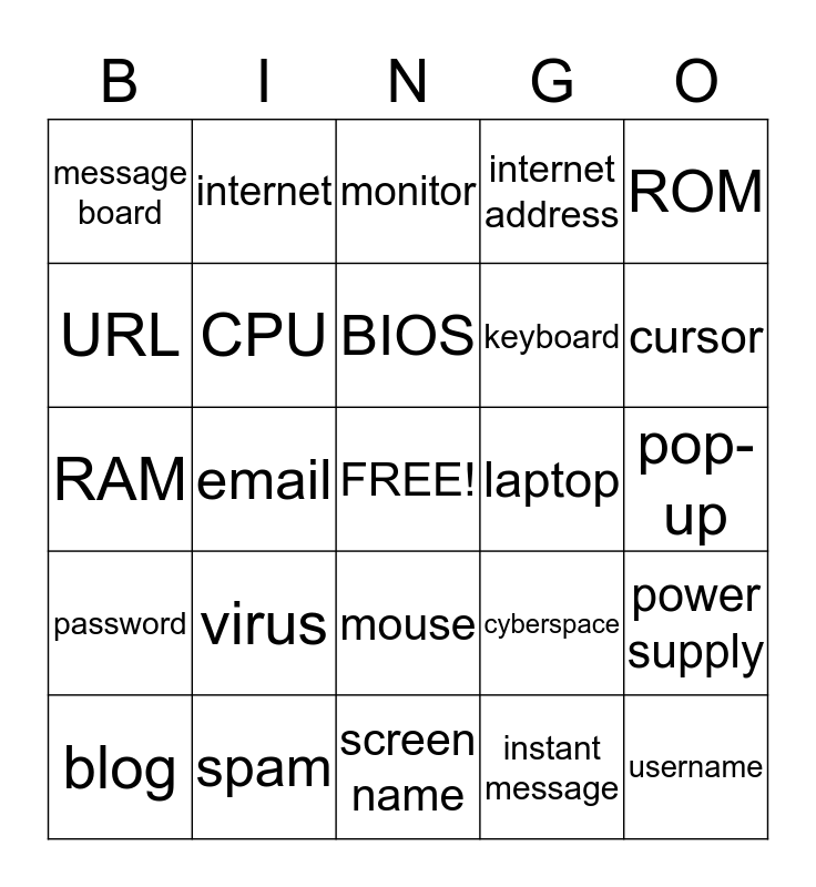 This bingo card has a free space and 24 words: virus, spam, BIOS, blog, ROM, message board, URL, internet, laptop, mouse, keyboard, RAM, cyberspace, power supply, CPU, instant message, pop-up, monitor, cursor, email, username, password, internet address and screen name.