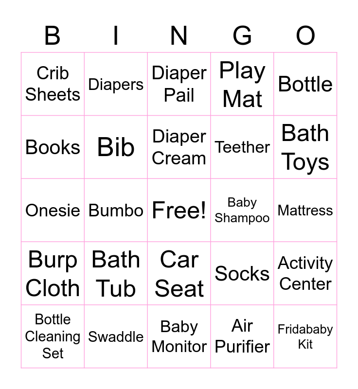 This bingo card has a free space and 33 words: Baby Wrap/Carrier, Pack-N-Play, Bumbo, Boppy, Burp Cloth, Bib, Bottle, Bottle Cleaning Set, Diapers, Changing Pad, Diaper Cream, Diaper Pail, Baby Wipe Dispenser, Bath Soap, Baby Shampoo, Bath Toys, Swaddle, Onesie, Bath Tub, Socks, Car Seat, Stroller, Crib Sheets, Mattress, Baby Monitor, Fridababy Kit, Play Mat, Teether, Books, Activity Center, Blocks, Air Purifier and Rattle.
