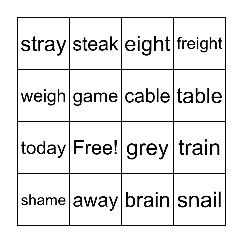 This bingo card has 18 words: Free!, snail, eight, stray, grey, freight, shame, steak, table, today, brain, weigh, train, game, cable, they, away and prey.