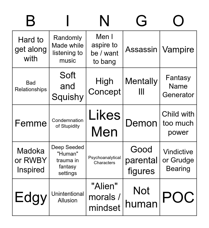 This bingo card has a free space and 34 words: "Human" vs "Monster", Not human, Full Psychological Profile, Oxymoronic Traits, Madoka or RWBY Inspired, Soft and Squishy, Vampire, Edgy, Randomly Made while listening to music, Depression Character, High Concept, Men I aspire to be / want to bang, Subtext Riddled, Angel, Demon, Fantasy Name Generator, Unintentional Allusion, Femme, Deep Seeded "Human" trauma in fantasy settings, Good parental figures, Psychoanalytical Characters, Martial Prowess, Hard to get along with, Child with too much power, "Alien" morals / mindset, POC, Assassin, Too much introspection, Mentally Ill, Bad Relationships, Protecting of the small, Condemnation of Stupidity, Vindictive or Grudge Bearing and Uses magic.