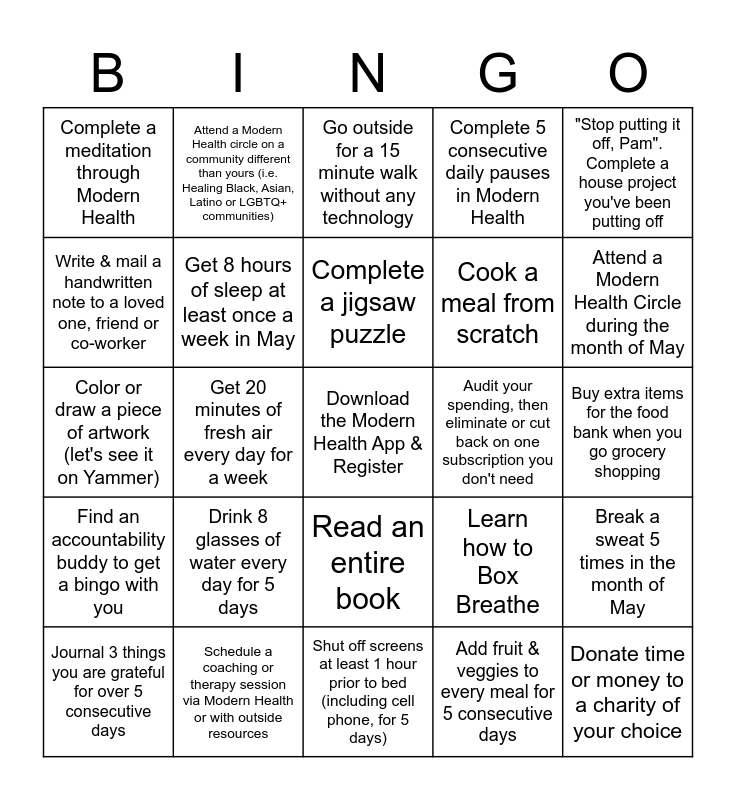 This bingo card has a free space and 24 words: Drink 8 glasses of water every day for 5 days, Schedule a coaching or therapy session via Modern Health or with outside resources, Complete a jigsaw puzzle, Journal 3 things you are grateful for over 5 consecutive days, "Stop putting it off, Pam". Complete a house project you've been putting off, Complete a meditation through Modern Health, Write & mail a handwritten note to a loved one, friend or co-worker, Attend a Modern Health circle on a community different than yours (i.e. Healing Black, Asian, Latino or LGBTQ+ communities), Audit your spending, then eliminate or cut back on one subscription you don't need, Read an entire book, Cook a meal from scratch, Color or draw a piece of artwork (let's see it on Yammer), Learn how to Box Breathe, Break a sweat 5 times in the month of May, Get 8 hours of sleep at least once a week in May, Add fruit & veggies to every meal for 5 consecutive days, Buy extra items for the food bank when you go grocery shopping, Go outside for a 15 minute walk without any technology, Attend a Modern Health Circle during the month of May, Get 20 minutes of fresh air every day for a week, Donate time or money to a charity of your choice, Find an accountability buddy to get a bingo with you, Complete 5 consecutive daily pauses in Modern Health and Shut off screens at least 1 hour prior to bed (including cell phone, for 5 days).