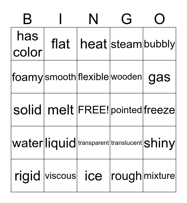 This bingo card has a free space and 24 words: liquid, viscous, flexible, rigid, bubbly, has color, foamy, flat, pointed, transparent, wooden, solid, translucent, shiny, smooth, rough, freeze, heat, gas, melt, mixture, water, steam and ice.