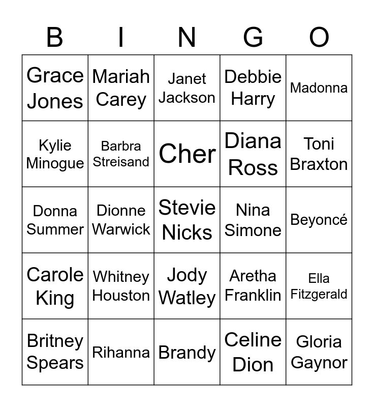 This bingo card has 25 words: Whitney Houston, Brandy, Cher, Britney Spears, Madonna, Grace Jones, Kylie Minogue, Mariah Carey, Nina Simone, Jody Watley, Diana Ross, Donna Summer, Aretha Franklin, Ella Fitzgerald, Barbra Streisand, Gloria Gaynor, Beyoncé, Janet Jackson, Toni Braxton, Dionne Warwick, Stevie Nicks, Rihanna, Carole King, Debbie Harry and Celine Dion.